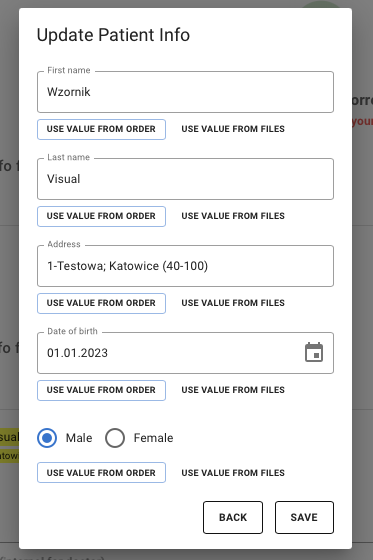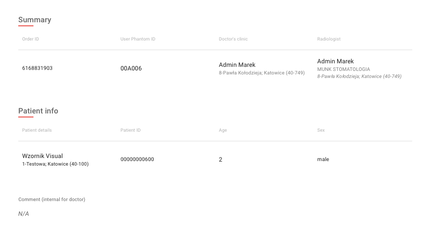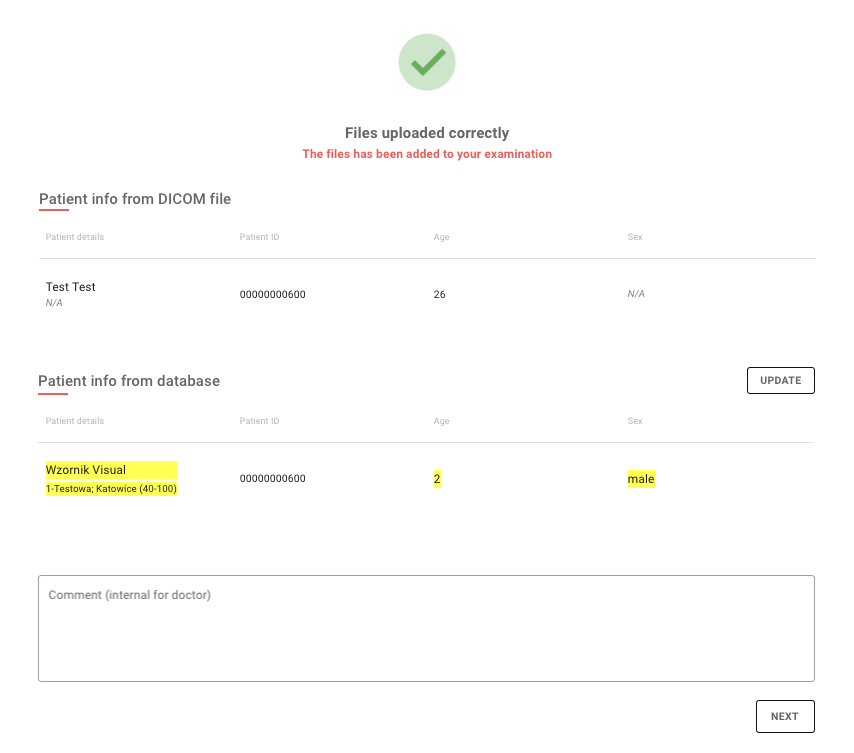 Po zakończonym procesie dodawania plików system przejdzie automatycznie do ekranu podsumowania podczas którego zweryfikuje zawartość metadanych pliku DICOM z zawartością zapisanych danych w kartotece simdensity. Oznaczenia na źółto wskazują różnice pomiędzy danymi.