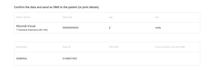 Wybrać radiologa współpracującego z naszą placówką i jednocześnie posiadającego wzornik gęstości „Send radiologist and send by SMS” – autoryzacja będzie odbywać się za pomocą SMS (kod autoryzujący pacjenta)